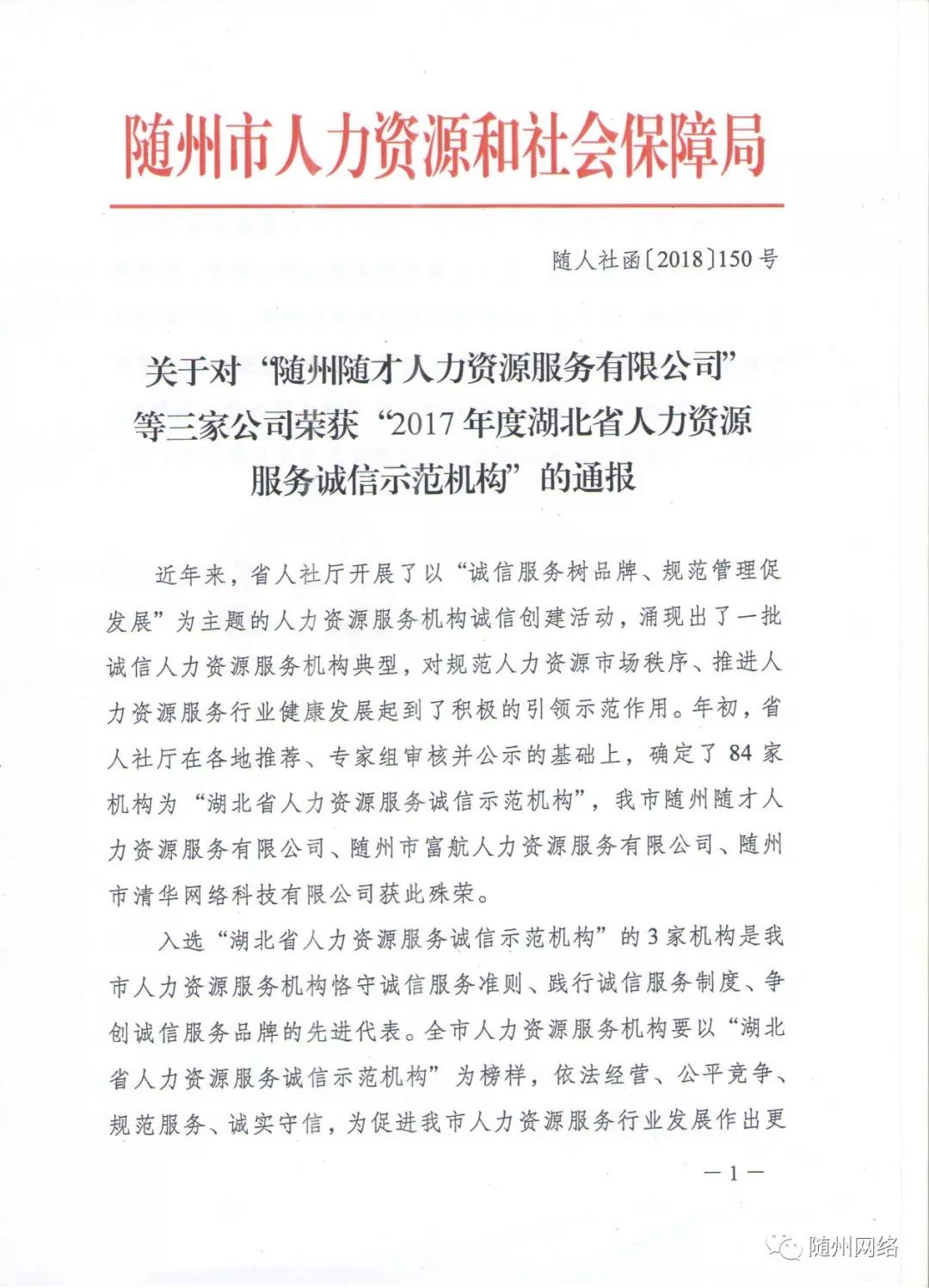 年初,省人社廳在各地推薦、專家組審核并公示的基礎上,確定了84家機構為“湖北省人力資源服務誠信示范機構”,我市隨州隨才人力資源服務有限公司、隨州市富航人力資源服務有限公司、隨州市清華網(wǎng)絡科技有限公司獲此殊榮。